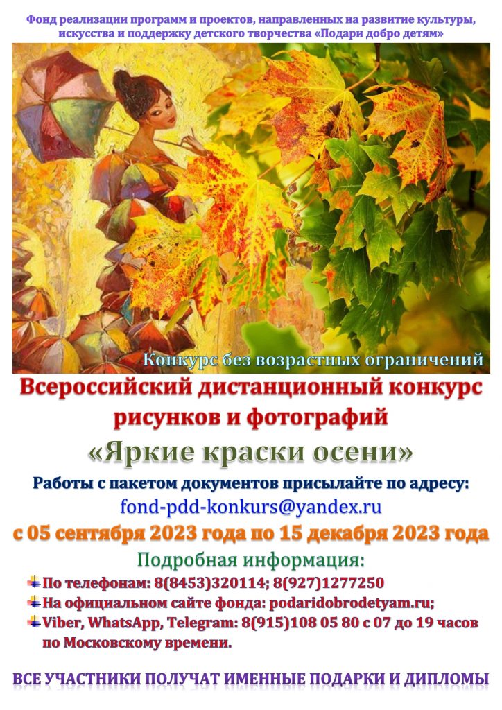 Всероссийский дистанционный конкурс рисунков и фотографий «Яркие краски осени» 29.09.202329.09.2023 admin Положение «Яркие краски осени»Скачать