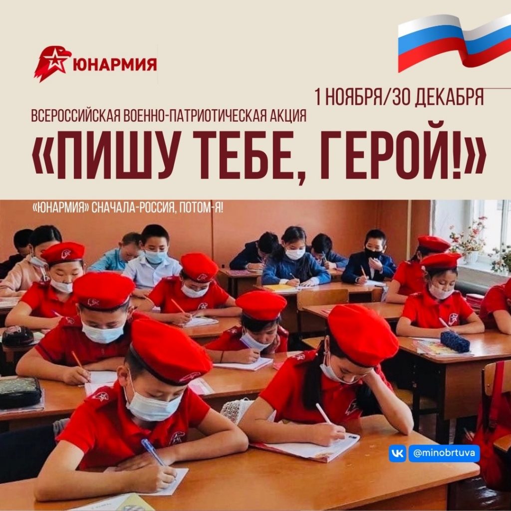 Пункт приема писем с пометкой «Пишу тебе, Герой!» — г. Кызыл, ул. Московская 44 УМЦ «Авангард» Республиканский центр развития допобразования. Напомним, военно-патриотическая акция «Пишу тебе, Герой!» стартовала 1 ноября одновременно с акцией «Блиндажная свеча». Акции продлятся до 30 декабря.