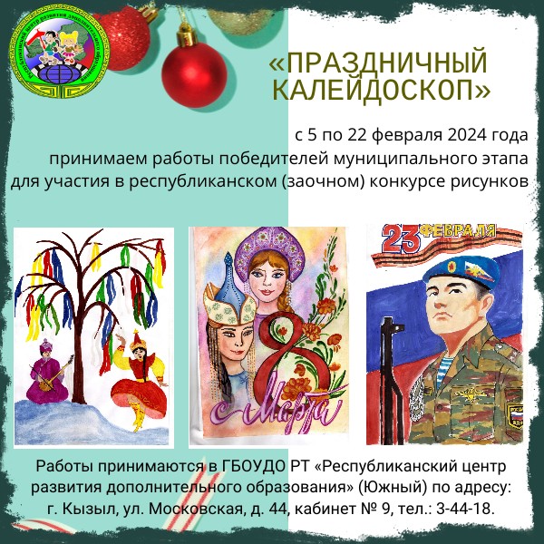 Республиканским центром развития дополнительного образования проводится республиканский (заочный) конкурс рисунков «Праздничный калейдоскоп». В нем принимают участие дети дошкольного возраста, обучающиеся общеобразовательных организаций, независимо от их организационно-правовой формы и ведомственной принадлежности, студенты средних специальных учебных заведений, педагоги дополнительного образования, воспитатели и учителя Республики Тыва.