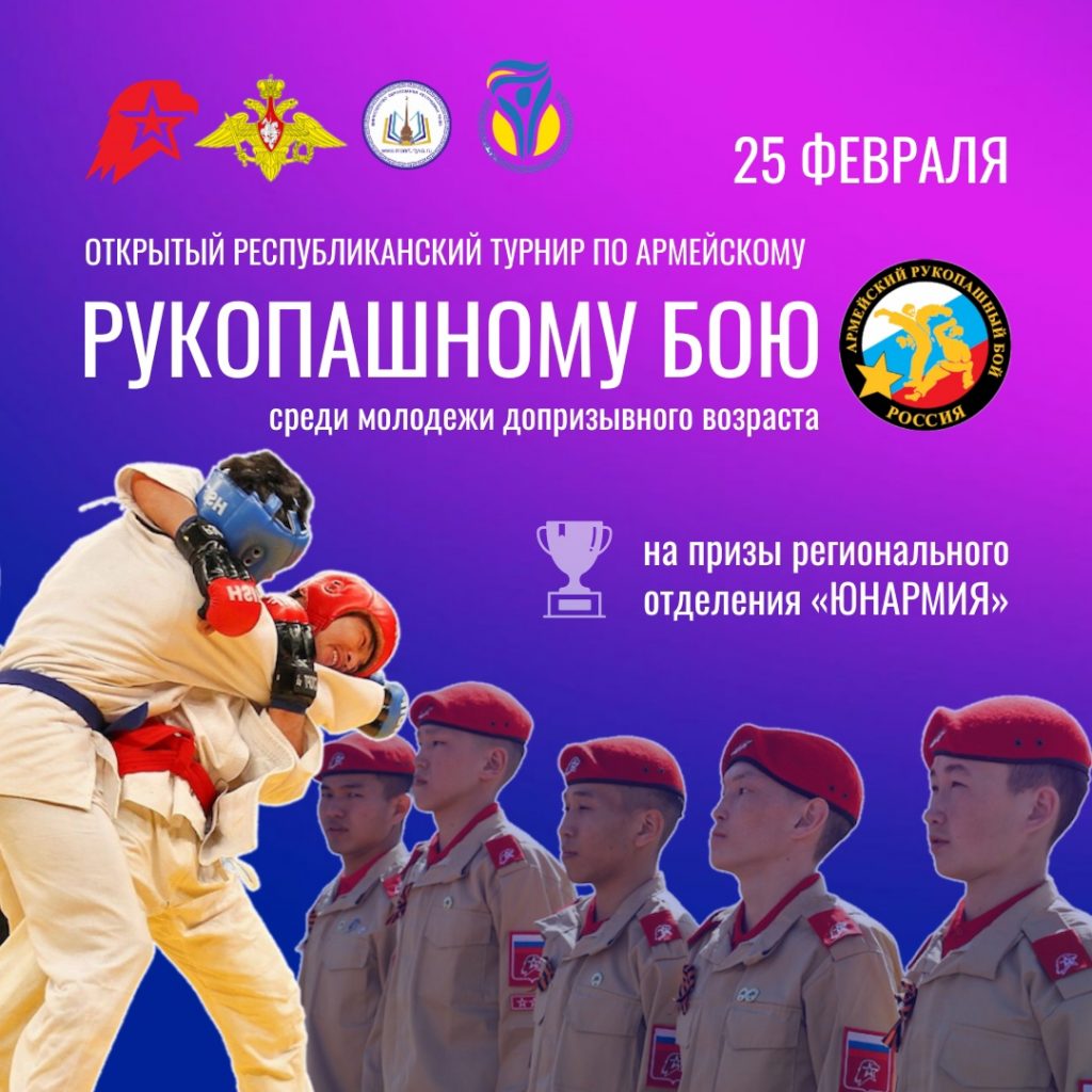 25 февраля в Туве впервые пройдет Открытый республиканский турнир по армейскому рукопашному бою на призы регионального отделения «ЮНАРМИЯ». Мероприятие посвящено празднованию Дня защитника Отечества.