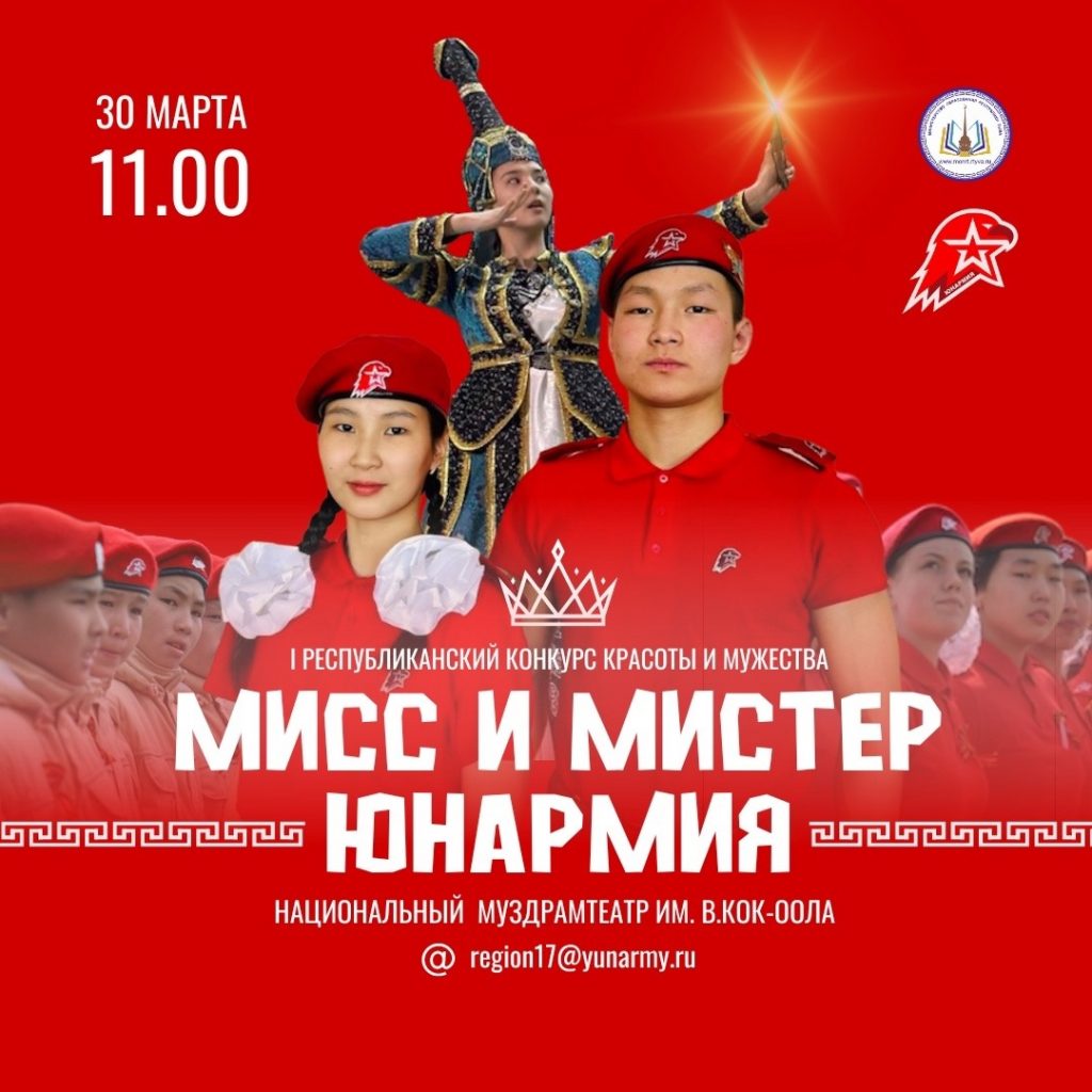 30 марта в Национальном музыкально-драматическом театре им. В.Кок-оола состоится I Республиканский конкурс красоты и мужества «Мисс и Мистер Юнармия — 2024» среди участников движения «Юнармия» 14-17 лет.