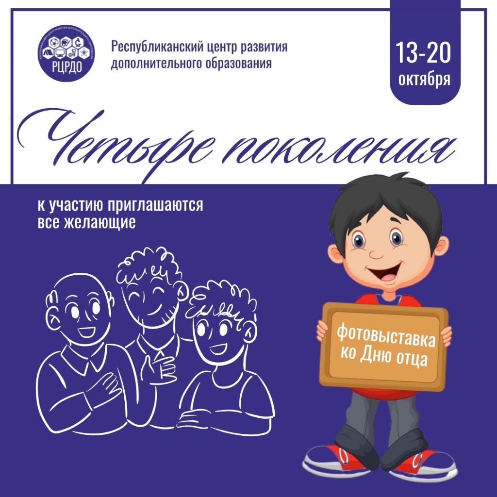 Рады сообщить о запуске фотовыставки «Четыре поколения», посвящённой Всероссийскому дню отца. Для участия в онлайн мероприятии необходимо разместить на своей странице в ВКонтакте фотографию семьи, на которой запечатлены четыре поколения отцов и их наследников (прадед, дед, отец и сын).Главная цель выставки — показать значимость отцовской роли в жизни семьи, подчеркнуть важность передачи опыта и ценностей из поколения в поколение. Принять участие в ней может любой желающий, в том числе семейные (трудовые) династии.Каждую работу необходимо сопроводить краткой историей семьи и отметить хештегом #ДеньОтца4поколения. Лучшие фотографии будут размещены на официальных ресурсах Республиканского центра развития дополнительного образования в День отца.