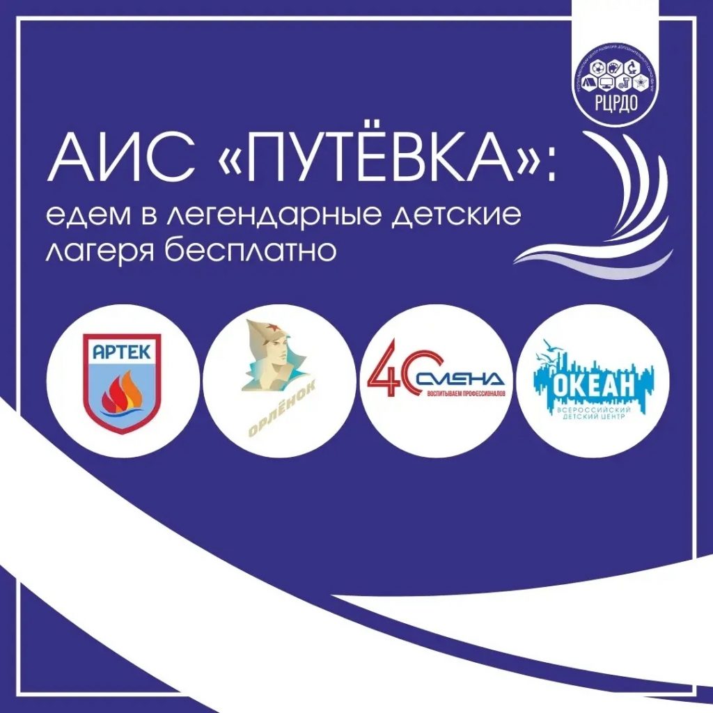 • ВДЦ «Океан» в Приморском крае.Бесплатными путёвками детей поощряют за достижения в учёбе, творчестве, спорте и общественной деятельности.С автоматизированной информационной системой (АИС) «Путёвка» поездка становится доступной для каждого ребёнка.У АИС «Путёвка» четыре преимущества: простота, беспристрастность, автоматическая группировка по интересам, удалённость.