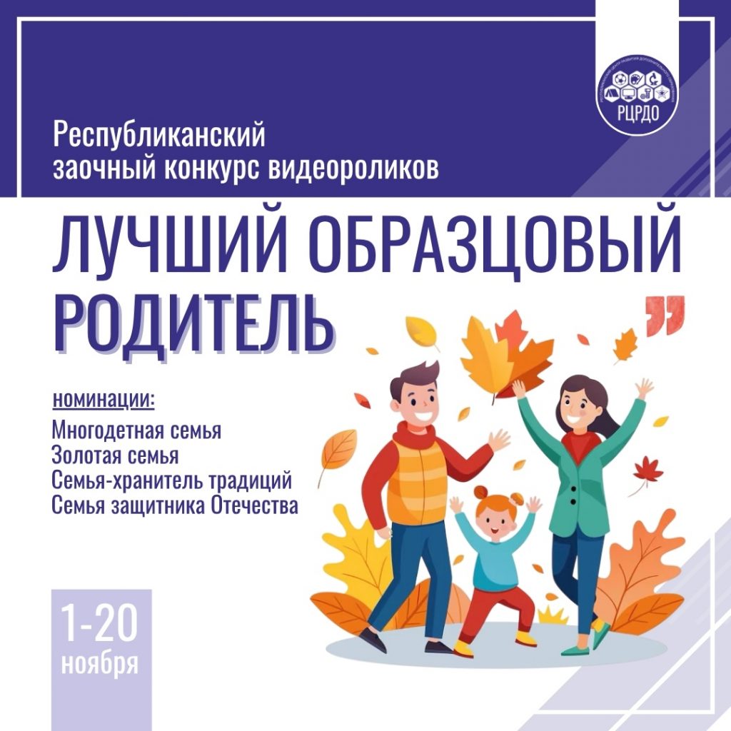 С 1 ноября дан старт Республиканскому заочному конкурсу видеороликов «Лучший образцовый родитель». Конкурс направлен на выявление и поддержку семей с активной жизненной позицией, заинтересованных во всестороннем саморазвитии.Продемонстрировать пример воспитания детей, развития семейных ценностей и поддержания позитивного образа родителя в обществе, в рамках участия в конкурсе, могут родители (законные представители) несовершеннолетних детей, независимо от возраста.Видео должно отражать жизненные ситуации, семейные традиции, интересные методы воспитания, раскрывать качество и смысл родительской любви и заботы. Продолжительность ролика — до 5 минут. Формат подачи — заочный, на республиканский этап, который пройдет с 15 по 20 ноября, принимаются работы победителей муниципального этапа (1-15 ноября) конкурса.Номинации конкурса:• «Многодетная семья» — участвуют семьи, воспитывающие трёх и более детей, в том числе приёмных.