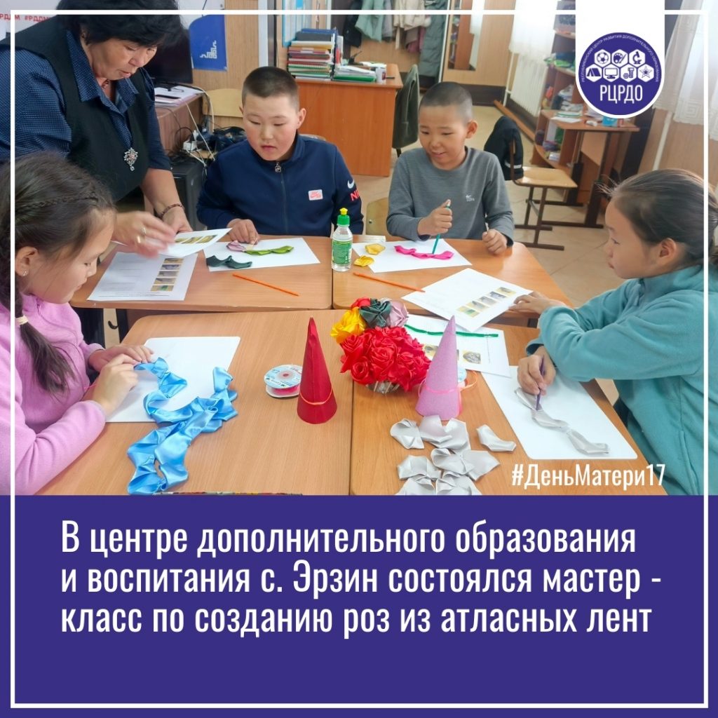 В преддверии самого тёплого семейного праздника — Дня матери — в центре дополнительного образования и воспитания с. Эрзин состоялся мастер-класс по созданию роз из атласных лент, ставший прекрасной возможностью для детей создать особенный подарок своим мамам.